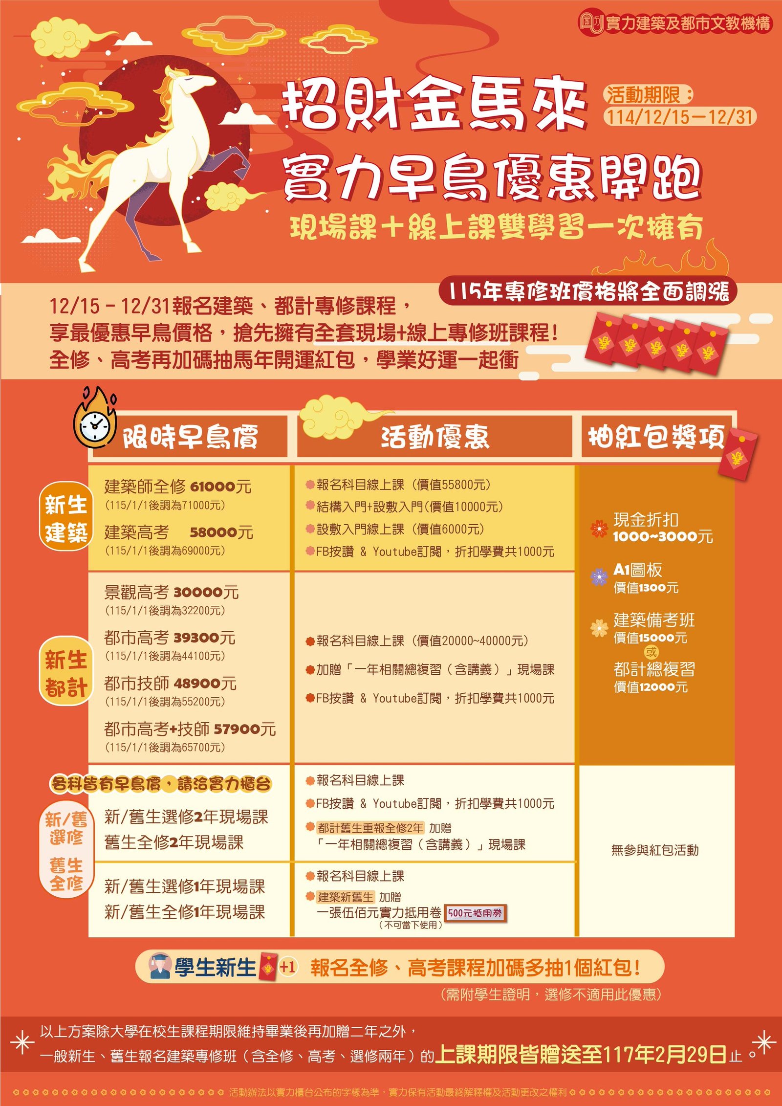 招財金馬來 實力早鳥優惠開跑 分類目錄 優惠活動, 最新活動, 最新消息 日期 2025 年 12 月 16 日 Share: shili 上一篇 【最新活動】11/29解題說明會,一日限定再加碼折扣! 2025 年 12 月 16 日 你可能也喜歡 【最新活動】11/29解題說明會,一日限定再加碼折扣! 25 11 月, 2025 普發加碼 滿額送課! 現金入袋、專業同步升級 7 11 月, 2025 建築都計11、12月.實力年間最優惠,錯過這次再等一年 7 11 月, 2025
