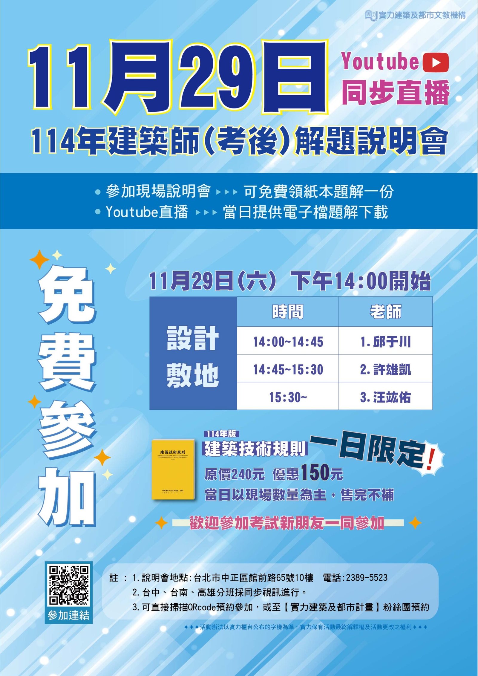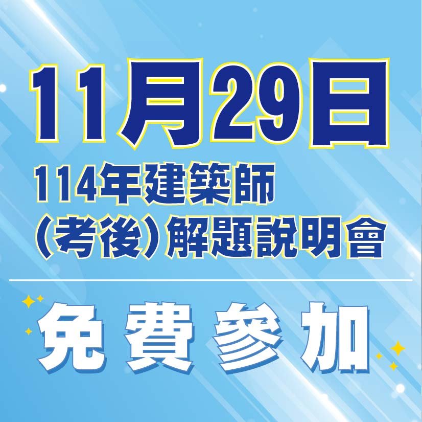 114年建築師解題說明會 分類目錄 最新消息 日期 2025 年 10 月 31 日 報名登記至11/25(二)15:00止!! Share: shili 上一篇 備考班影片優惠方案 2025 年 10 月 31 日 你可能也喜歡 實力建築/都計·九~十月全修優惠 28 8 月, 2025 建築設計敷繪成功對策班 1 8 月, 2025 8月建築高普考設計解題說明會 29 7 月, 2025